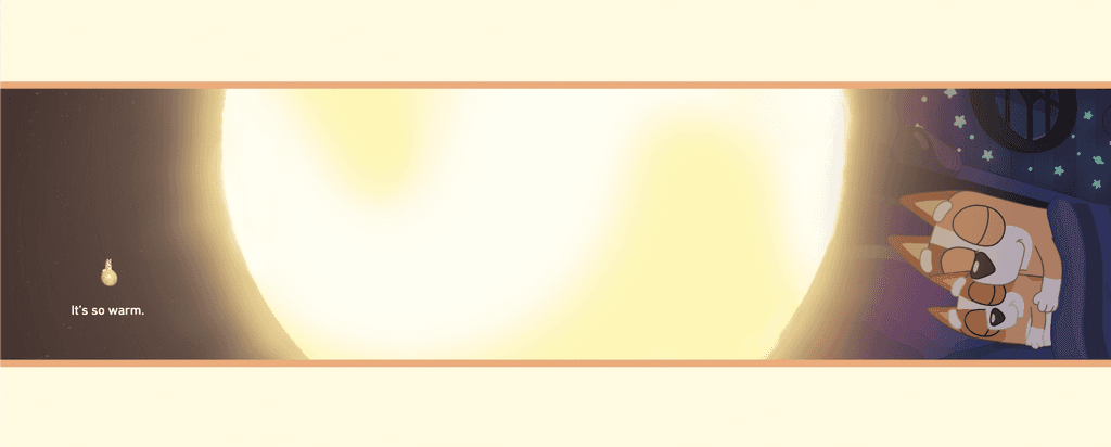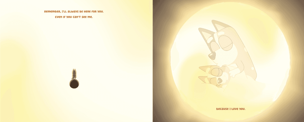 In Bluey: Sleepytime, the major storyline follows Bingo, the younger sister, reflecting on her wishes to become more independent. As she falls into a deep sleep, her dreams project her goal and the support she receives from her family. The text reads: “But Bingo remembers that she wants to do a big girl sleep and wake up in her own bed”. This scene shows Bingo at a turning point in her development as she courageously decides to have "a big girl sleep." Bingo's determination is highlighted by the straightforward language and brief lines, and the phrase "big girl sleep" is memorable and understandable for young readers. The text then follows: “Bingo stands up. I have to go...I’m a big girl now.” Children are inspired to identify with Bingo's desire for independence by these relatable encouraging words. Young readers can internalize and repeat the phrase's simplicity, particularly "I'm a big girl now," which makes the experience more engaging and memorable.