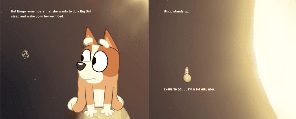 Repetition also falls into play as it is a foundational element in a majority of children’s literature, particularly for stories targeting early readers. By echoing the phrase like “I’m a big girl now”, the book reinforces Bingo’s wishes to step into a world of independence as both achievable and empowering. This repetition not only assists in developing comprehension but also builds a strong emotional connection with Bingo’s journey. allowing children to see bravery in acts of growth that can be big or small.